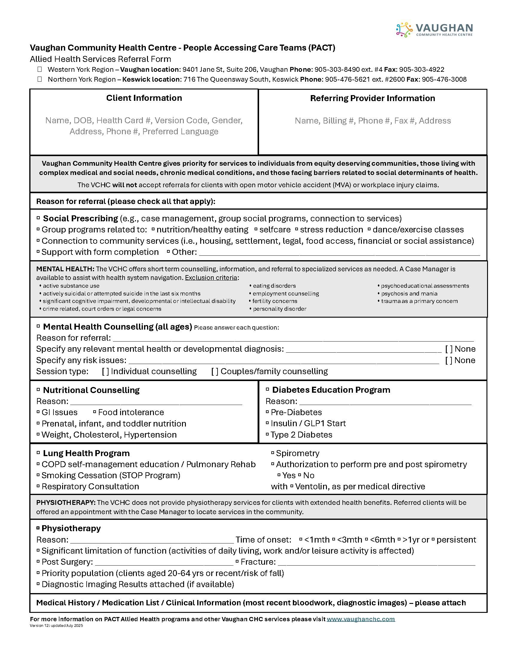 If you are from the Western York Region area please visit our Allied Health- People Accessing Care Teams Page for more information on how to access the PACT program.